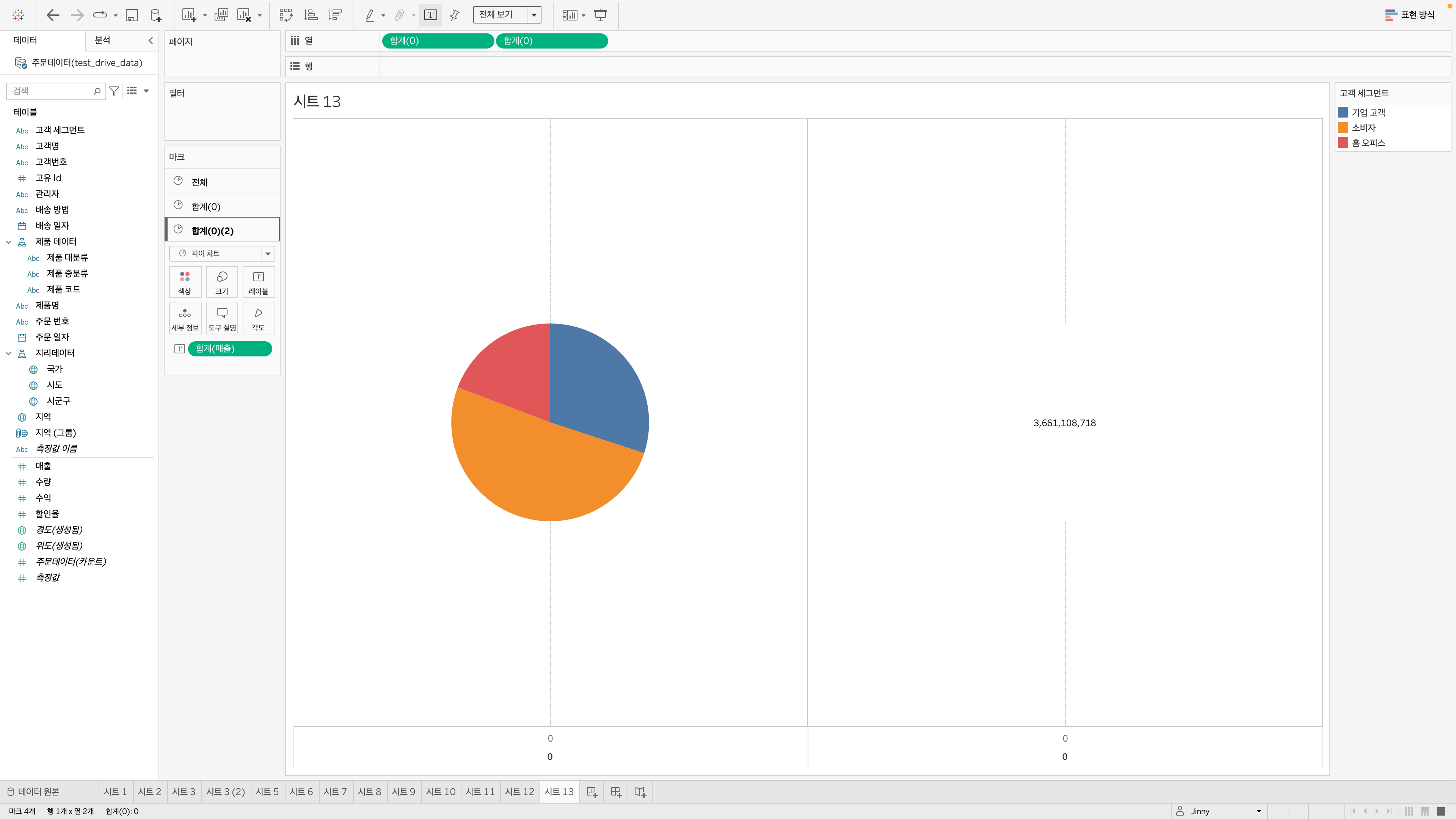 매출을 '크기'로, 합계를 '색상'으로 끌고 감